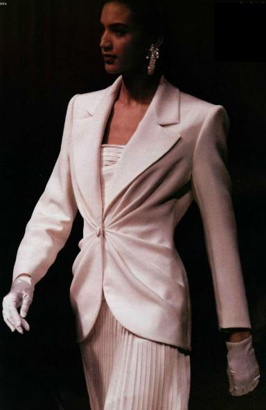 Scherrer 1989. Tailleur robe blanc. Robe à plis horizontaux, veste à plis en X fermée par un bouton.