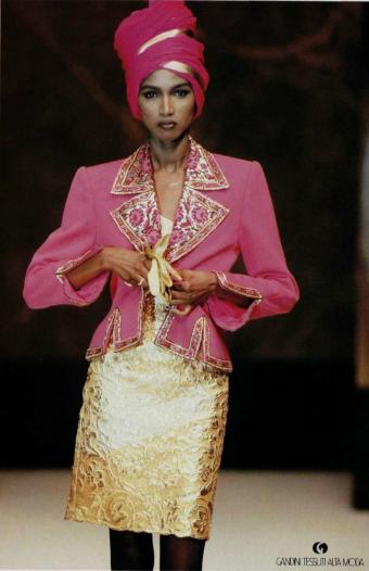 Scherrer 1989. Tailleur robe composé d’une robe dorée en tissu floqué et d’une veste rose à col très travaillé, décor de fleur sur fond blanc. Toque-turban rose et dorée. Gants assortis.